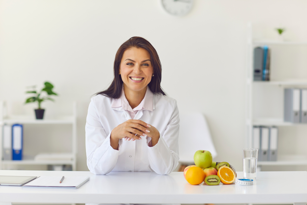 Positive,Dietician,Sitting,At,Office,Desk,With,Fruit,And,Glass | Dietitian Support